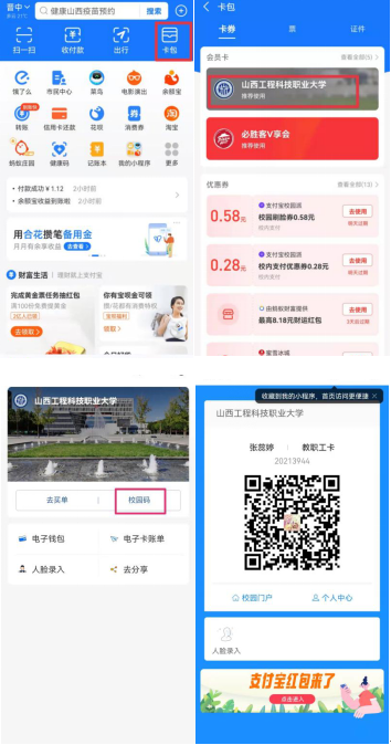 打开支付宝,选择右上角“卡包”---打开山西工程科技职业大学校园卡---选择校园码,如图3所示,校园码正对校园码扫码区(人脸识别区域下方)识别后通行。