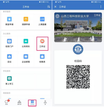 打开企业微信,选择“工作台”---点击“工作证”,即显示“校园码”,如图2所示,校园码正对校园码扫码区(人脸识别区域下方)识别后通行。