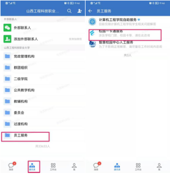 (2)通过企业微信内“通讯录”---选择“员工服务”---点击“校园一卡通服务”发消息反馈相关问题,如图5所示。
